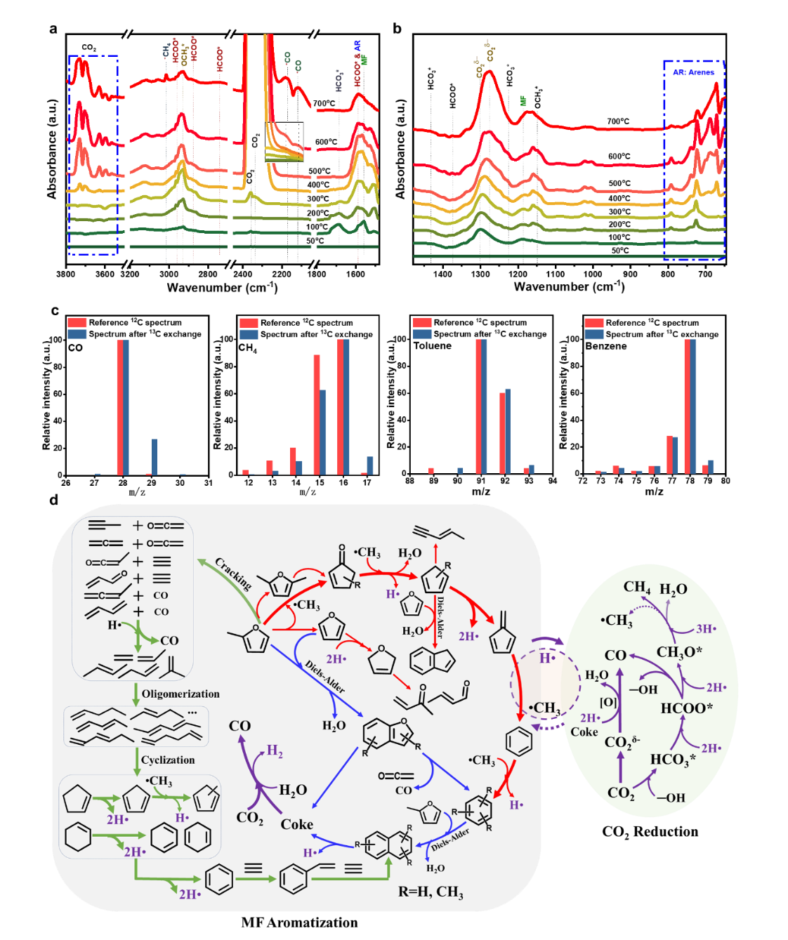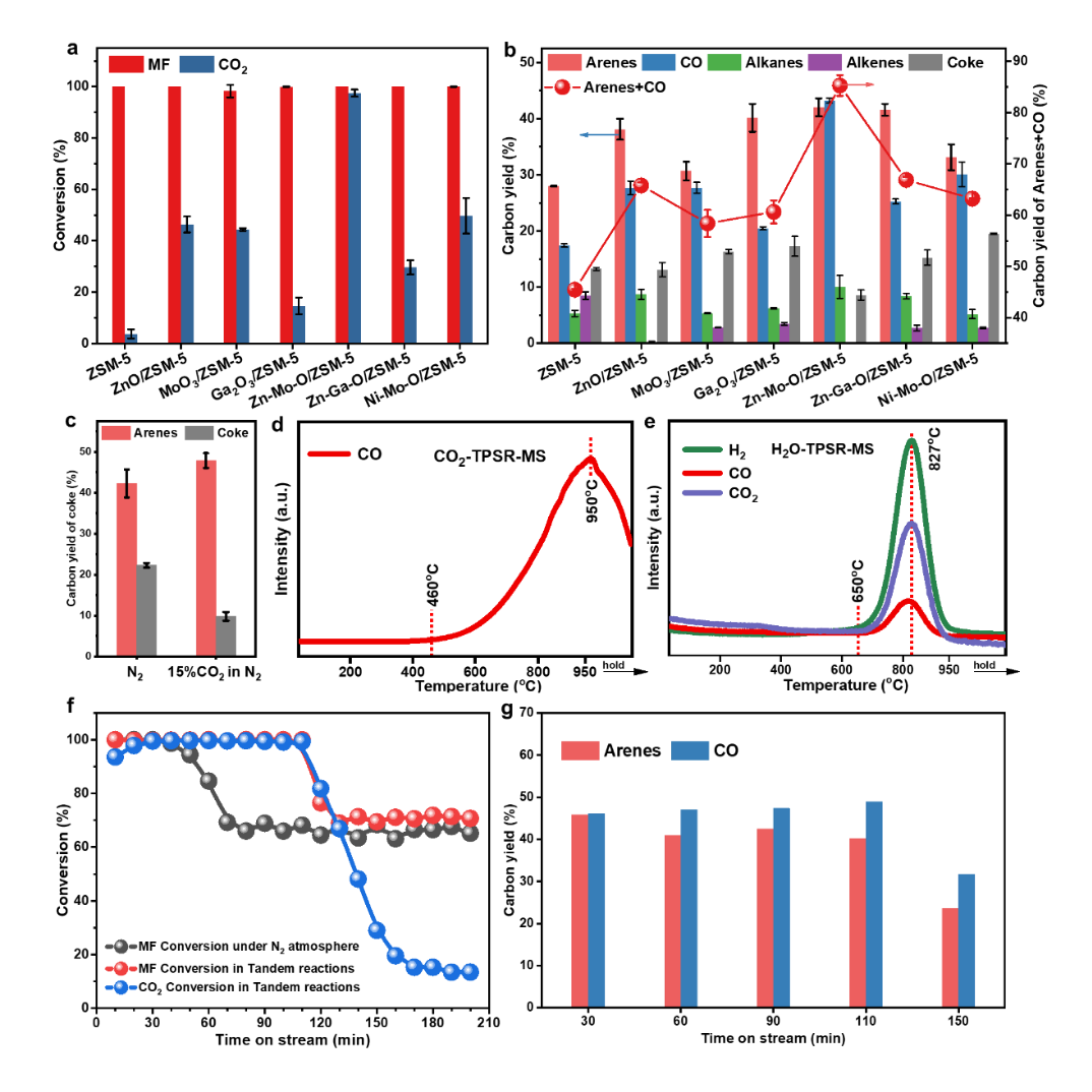 该研究表明,Zn-Mo-O/ZSM-5双功能催化剂不仅有效提高2-甲基呋喃和CO2转化率(超过97%),同时也使得目标产物芳烃和一氧化碳的碳收率超过85%,副产物烯烃含量几乎可以忽略不计(0.05%),催化剂上的积碳生成量从22.3%降至8.6%。 此外,CO2的加入有效提高了反应的稳定性,稳定运行时间从 40 分钟延长到 110 分钟。同步辐射真空紫外光电离反射飞行时间质谱(SVUV-PI-ReTOF-MS)、13C同位素示踪、原位漫反射傅里叶变换红外光谱(DRIFT)等先进表征技术进一步揭示了ZnMoO4/ZSM-5催化剂选择性地调控反应中间体和反应路径的作用机制。该研究为CO2和生物呋喃的共转化给予了新思路。